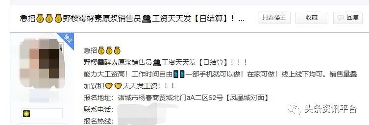 在眼下,果然也有一些网络推广员在各大贴吧发布这些所谓的“急招野樱霉酵素原浆销售员,工资天天发”的消息。