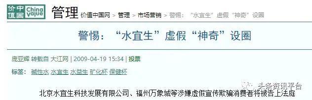 其实,早在1999年时,美国联邦贸易委员会就禁止了美国两家公司宣称其所生产的“磁化水”具有治疗功能。目前,在齐鲁网曝光台、价值中国网等网站上,水宜生更是被专家称其宣传方式过于离谱,相关虚假宣传行为更是屡遭举报。