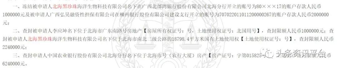 那么,这起事件的后续处理得如何呢?据《中国银行股份有限公司北海分行、北海黑珍珠海洋生物科技有限公司金融借款合同纠纷执行实施类执行裁定书》披露,广西壮族自治区北海市海城区人民法院在执行申请执行人中国银行股份有限公司北海分行与被执行人北海黑珍珠海洋生物科技有限公司、李应坤、喻文才、喻文利金融借款合同纠纷一案中,已向被执行人发出执行通知书,责令其立即履行生效文书确定的义务,并依法调查被执行人的财产及收入情况(工商、房产、车辆、银行),目前扣划了被执行人名下银行存款共3596473.4元,并已将该笔款项退予申请执行人。