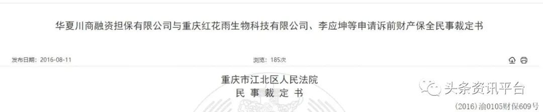 尤其是涉及到财产冻结的官司诉讼,据《华夏川商融资担保有限公司与重庆红花雨生物科技有限公司、李应坤等申请诉前财产保全民事裁定书》显示,重庆市江北区人民法院查封、冻结或扣押被申请人重庆红花雨生物科技有限公司、北海黑珍珠海洋生物科技有限公司、喻文才、李应坤、贺义琴、李胜、喻文碧名下价值530万元的财产。