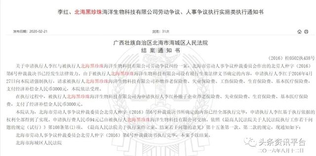 除了上述这些涉及金额数目巨大的诉讼事件外,该公司的前员工们也曾因劳动争议等一些数目较小的资金问题,将该公司诉至法院,虽然当地的劳动人事争议仲裁委员会作出的北劳人仲字(2016)第6号仲裁裁决书已经发生法律效力,但由于被执行人北海黑珍珠海洋生物科技有限公司没有履行生效法律文书确定的内容,申请执行人李红于2016年4月27日向法院申请强制执行,请求被执行人补缴养老保险费、失业保险费、工伤保险费、生育保险费、基本医疗保险费,支付经济补偿金人民币3000元,在执行过程中,被执行人北海黑珍珠海洋生物科技有限公司为其补缴了相关费用。