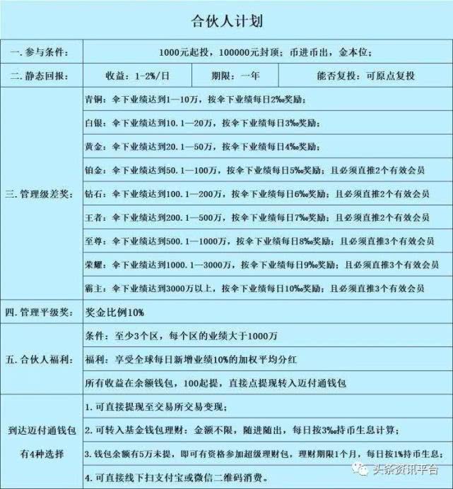 另外,“合伙人福利”也在该奖金制度中占有举足轻重的地位,拿到该福利的条件是至少三个区,每个区的业绩都大于1000万元,福利是享受全球每日新增业绩10%的加权平均分红,所有收益在余额钱包,100起提,直接点提现转入迈付通钱包。