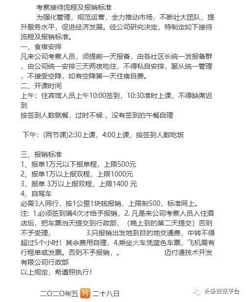 最近一段时间,迈付通正在“跑马圈地”阶段,全国各地的参与者都在积极开会、组织活动,以招募其他人员加入,西安地区在这方面搞得尤为火热,具体的考察接待流程及报销标准如下:
