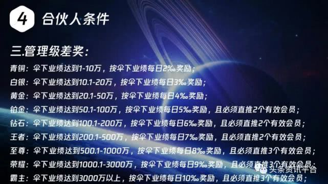 动态收益,也称“管理级差奖金”,迈付通按照业绩和推荐人数将参与者依次分为青铜、白银、黄金、铂金、钻石、王者、至尊、荣耀和霸主等几个级别。