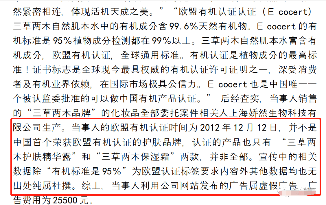 当事人欧盟有机认证时间为2012年12月12日,并不是首个获得欧盟有机认证的护肤品牌,认证的产品也只有两款,并非全部。相关标准除“有机标准是95%”其他均为杜撰。