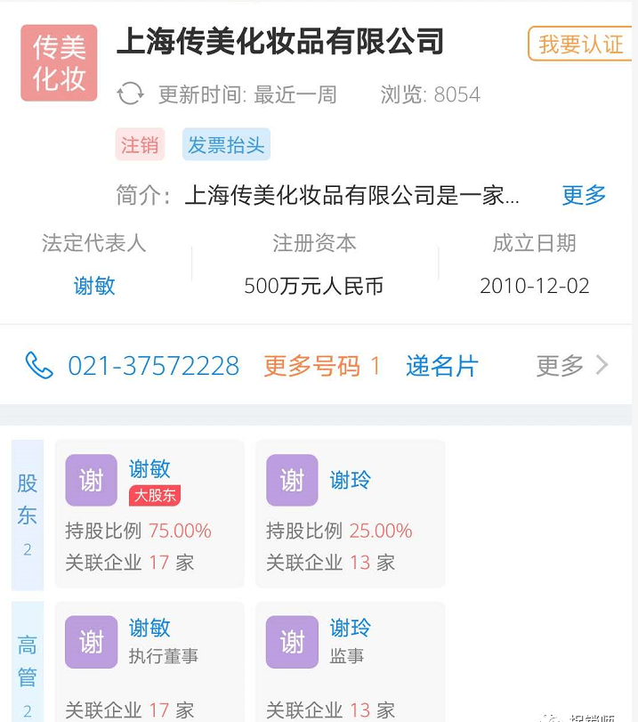 前文宣传中的2011年注册的上海传美应为上海传美化妆品有限公司,该公司成立于2010年12月。法人谢敏,持股75%,担任法人、控股或者高管的企业有17家。