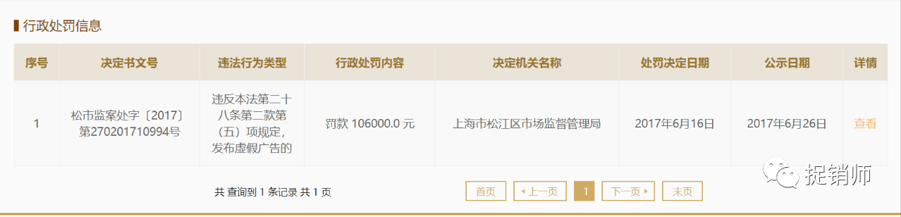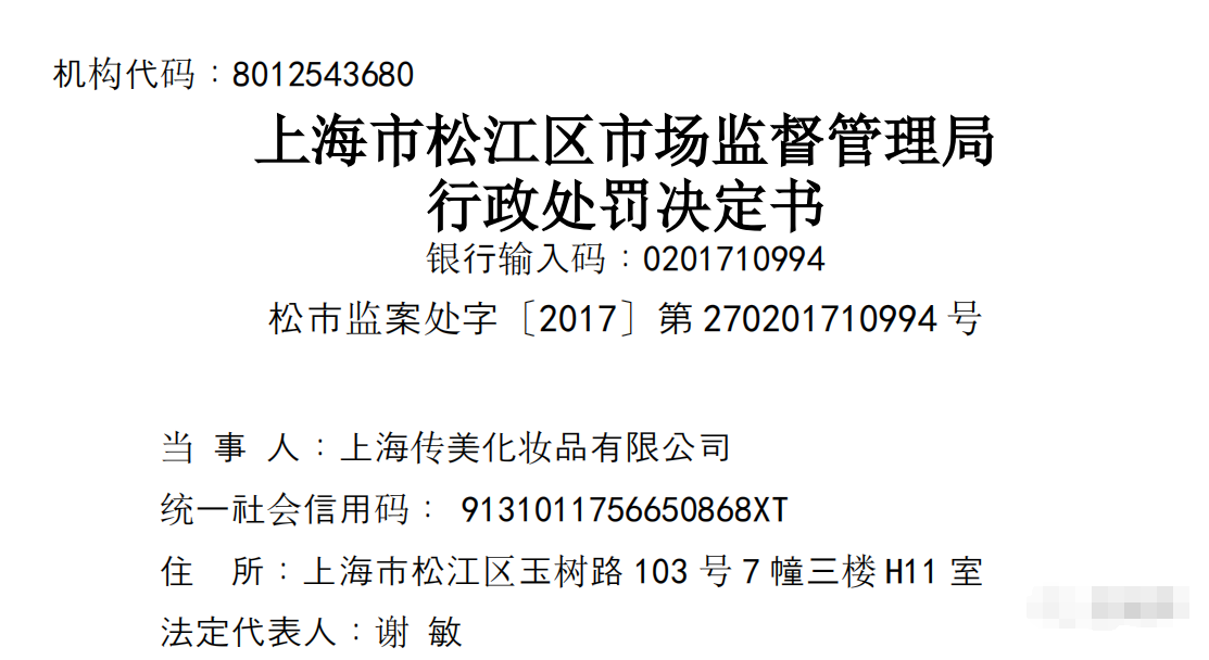 时间回到2017年,传美化妆品因发布虚假广告遭到上海市松江区监管局处以106000元的处罚。