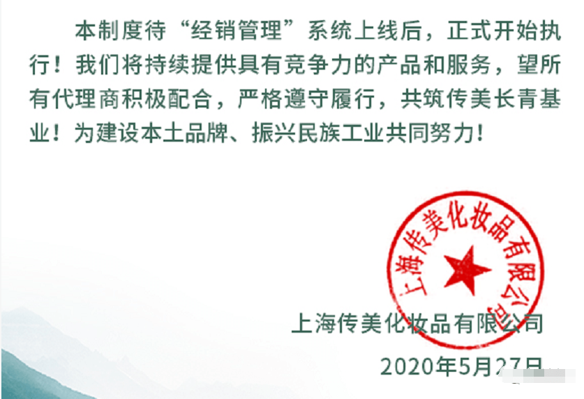 上海传美化妆品公司于2018年9月发布的招商销售模式。