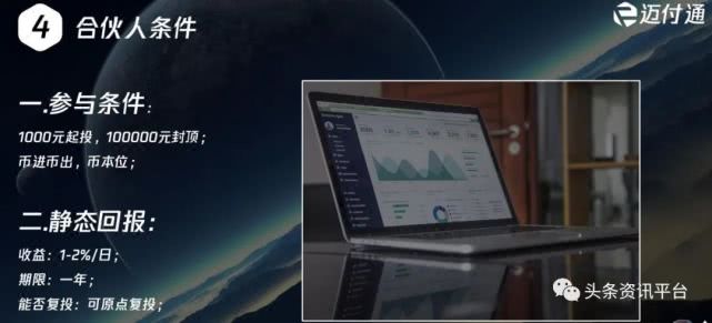 接下来,我们再来看一下迈付通的参与者能收获怎样的收益。据了解,具体投资收益包括以下四个部分,分别是静态收益、动态收益、平级奖和合伙人福利。