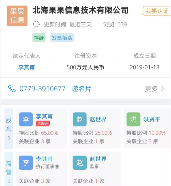 作为淳肌新电商经营主体的北海果果信息技术有限公司成立于2019年1月18日,法定代表人李其甫,注册资本500万元,认缴出资时间为2025年,股东有李其甫(大股东)、洪贤平、赵世界。