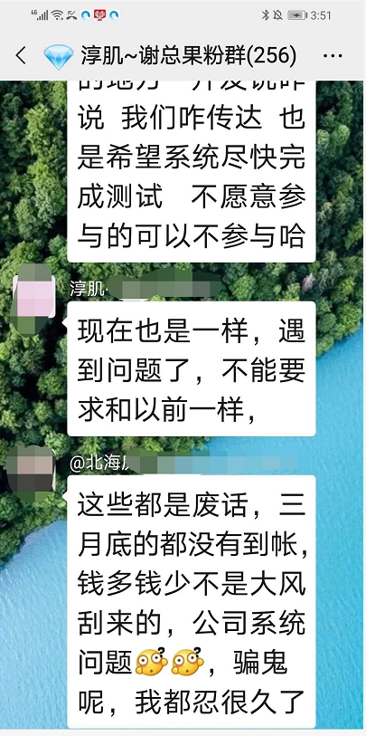 在拥有256名群组成员的淳肌谢总果粉群中面对公司的推脱行为甚至有人直言:公司系统问题?骗鬼呢!