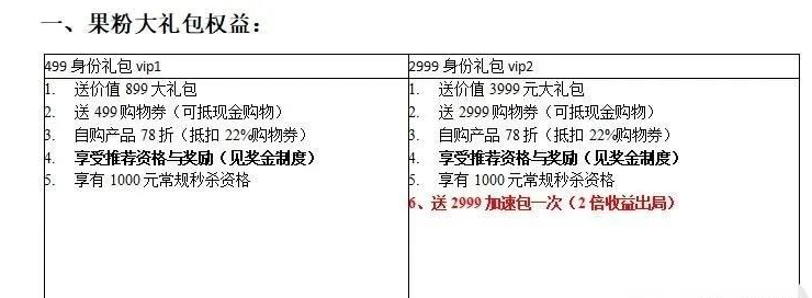 淳肌新电商制度设置有两个加盟门槛,分别是499元和2999元。购买499元的果粉大礼包可以获得以下五项权益:1.送价值899元的大礼包;2.送499购物券(可抵现金购物);3.自购产品78折(抵扣22%购物券);4.享受推荐资格与奖励(见奖金制度);5.享有1000元常规秒杀资格。