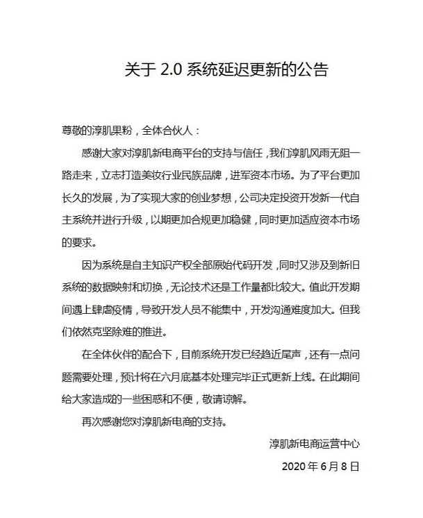 2020年6月8日,淳肌新电商运营中心发布推迟更新的公告,公告中称,因疫情原因导致开发人员不能集中,难度加大。预计在6月底基本处理完毕正式更新上线。