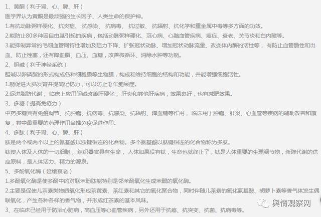 该产品的主要成分例如黄酮具有抗炎症抗感染和抗病毒功效,能防止80多种因自由基引起的疾病,诸如冠心病、心脑血管疾病、甚至是癌症;胆碱可以促进大脑发育防止老年痴呆,此外对肝类疾病如肝炎肝硬化都有显著效果;多糖则具有调节免疫、抗病毒、抗感染、抗辐射、降血糖甚至抗肿瘤的作用,对肿瘤与心血管疾病有改善促进作用。