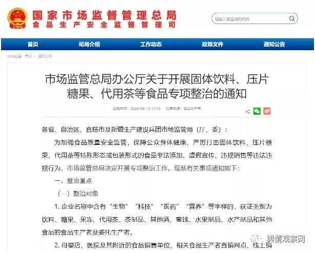 5月14日,国家市场监管总局发布题为《严厉打击固体饮料、压片糖果、代用茶等特殊形态或包装形式的食品非法添加、虚假宣传等违规行为》的通知,引发了行业关注。