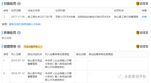 眼下,三旺集团董事长杨峰名下的山东三旺富硒农产品有限公司(有消息指出,该公司早在五六年前已涉水直销,当时,“富硒妈妈”、“绿旺”两大富硒农产品品牌已经正式推出)已因未依照《企业信息公示暂行条例》第八条规定的期限公示年度报告,而连续两年被微山县市场监督管理局列入经营异常名录,2017年11月时,该公司又因虚假宣传被微山县工商行政管理局进行了行政处罚。