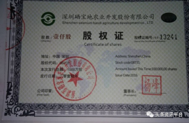 至于股权和上市的传闻,有推广人员还煞有其事地在其工作室内贴出了深圳硒宝地公司在深圳联交所托管挂牌的信息,早前,曾有网友就股票代码08731进行咨询,对此,一位金融证券行家表示:“没有这个股票,股票一般都是6位数,它只是深圳联合产权交易所进行集中登记和托管,没有上市”。