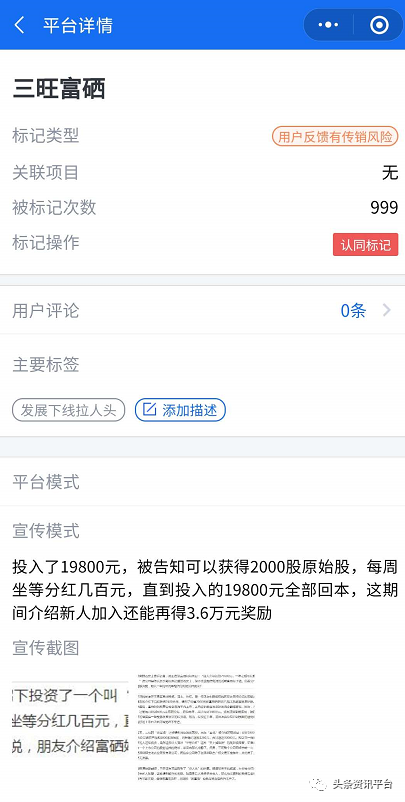 眼下,在腾讯灵鲲金融风险监管平台上,“三旺富硒”这个关键词已被标记了999次,标记类型是“用户反馈有传销风险”,主要标签有“发展下线拉人头”的字样。