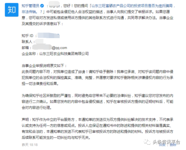 此外,还曾有网友在知乎社区上对该公司的模式进行咨询,发声质疑的网友不计其数。结果没过多久,三旺集团的工作人员就对其进行了举报,并要求删除。但时至今日,该网友的提问仍安然无恙。虽然没被删除,不过该问题已处于关闭状态,原因是“侵犯企业的权益”。
