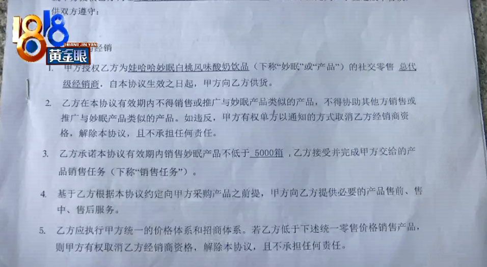 近日,中新融媒注意到,1818黄金眼报道了题为《交了十万块钱做“娃哈哈妙眠”总代,再去总部却急得满头大汗......》一文,该新闻中提到,有一位孙先生反映,4月18号,他到杭州娃哈哈妙眠全国运营中心签了一份代理协议,交了十万元保证金,最近他发现自己有可能被骗了。
