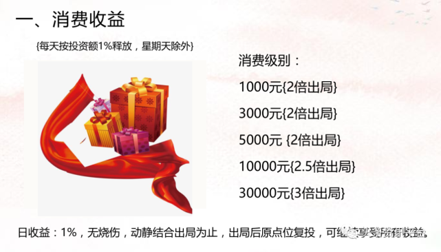 第一项收益是消费收益,所谓的消费收益指的是每天按投资额的百分之一释放,星期天除外,消费级别包括1000元(2倍出局)、3000元(2倍出局)、5000元(2倍出局)、10000元(2.5倍出局)和30000元(3倍出局),资料对该项收益补充道:日收益为百分之一,无烧伤,动静结合出局为止,出局后原点位复投,可继续享受所有收益。