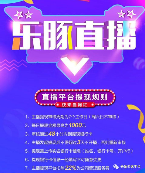 具体的乐豚直播收益则包括以下五点:第一,客户充值按100元计算,充值平台赠送40%,实际购买到账钻石为140钻;第二,客户把140钻打赏给主播,主播提现10个工作日到账,平台扣除管理费,主播实际收益为109元;第三,客户充值2000元和5000元,平台赠送50%,按2000元充值计算,实际购买钻石为2999钻;第四,客户把2999钻打赏给主播,主播提现10个工作日到账,主播到账实际收益为2340元;第五,平台主播二维码推荐客户下载注册,客户充值,给主播返佣充值金额的1%为奖励。返佣秒到,主播端可提现。