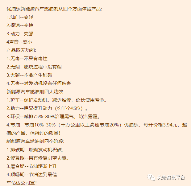 最近一段时间,车亿达的爆红,也让许多人联想到了曾红极一时的车小将,2018年初,许多人的微信朋友圈也被“车小将”刷屏了。在相关宣传视频中,有人声称只要加“车小将”,汽车就可以照常行驶了,能代替汽油。与此同时,“车小将”还只对会员销售,价格为3.7元/升,投资30万元可成为地域代理,不仅享受拉人头入会的10%提成,还能得到45万元的货。
