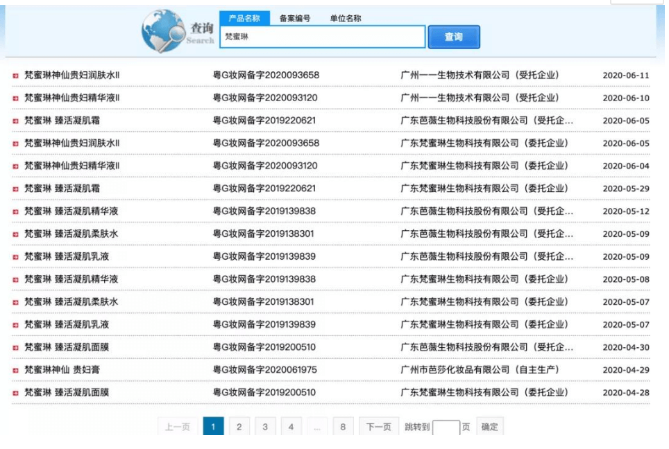 该品牌旗下主打的“神仙贵妇三部曲”系列产品(包含梵蜜琳神仙贵妇膏、梵蜜琳神仙贵妇润肤水、梵蜜琳神仙贵妇精华),也因产品宣称中含有“神仙”一词而涉嫌违规。根据国产非特殊用途化妆品备案平台(下称非特备案平台)信息显示,梵蜜琳神仙贵妇膏于2020年2月25日获得产品备案,梵蜜琳神仙贵妇润肤水、梵蜜琳神仙贵妇精华的备案日期均显示为2020年1月13日,三款产品的生产企业均为广东梵蜜琳生物科技有限公司。