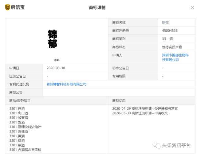 在眼下,由深圳锦郁生物公司申请的“锦郁”商标尚处于等待实质审查的状态。