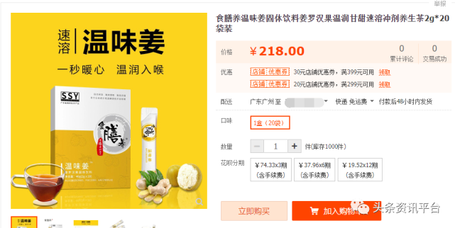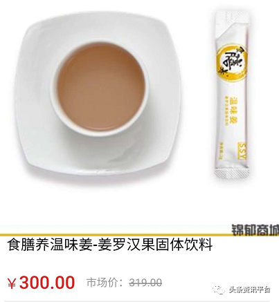 经查,该产品在淘宝上的售价为218元,在锦郁商城上的售价却高达300元,而且在锦郁商城上的相关页面当中,单价标为300元的食膳养温味姜姜罗汉果固体饮料还被提示:单盒不发货,累计四盒才发货。