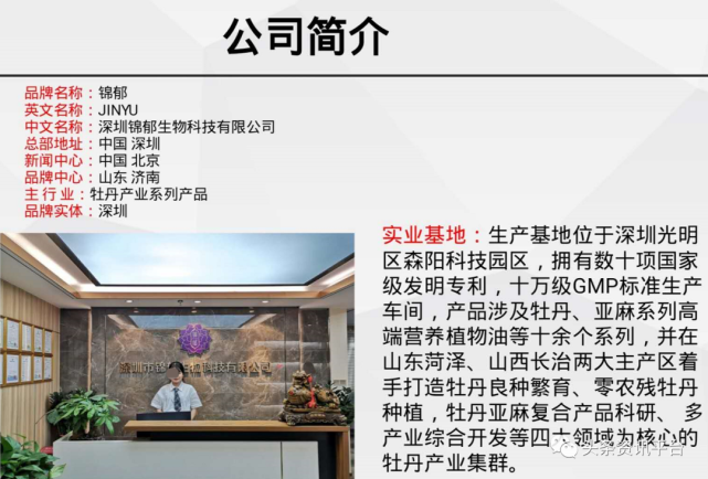 在深圳锦郁生物公司的运营团队方面,孟庆利为首席顾问,王培良为品牌顾问,赵孝庆为牡丹产品顾问。