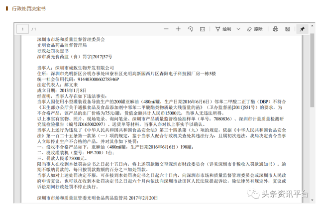 经查国家企业信用信息公示系统,据相关处罚决定书披露:经查明,当事人存在如下违法事实:当事人使用小型灌装设备导致生产的200罐亚麻油(480ml/罐,生产日期2016年6月6日)邻苯二甲酸二正丁酯(DBP)不符合《卫生部办公厅关于通报食品及食品添加剂中邻苯二甲酸酯类物质最大残留量的函》。,于是,有关部门责令当事人立即停止生产不合格的产品,并对其作如下处罚:一、没收不合格产品如下:亚麻油(480ml/罐,生产日期2016年6月6日)198罐;二、没收灌装机(型号:HP-200)1台;罚款人民币75000元。