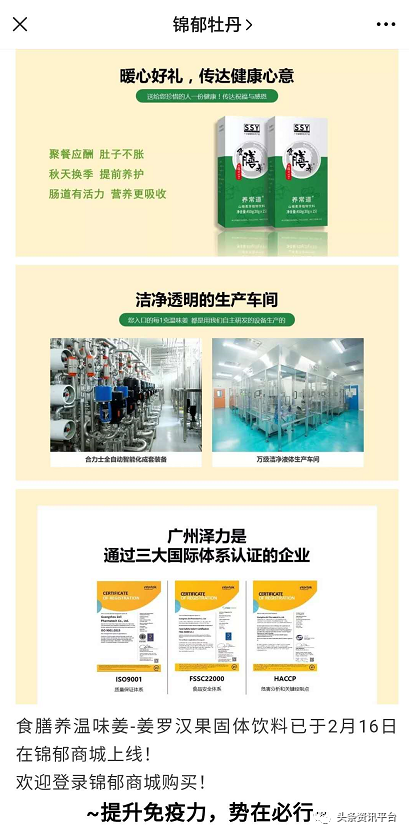 名为“锦郁牡丹”的公众号在推送这些产品时,恰逢国内新冠疫情爆发时期,为了能和“时事”结合,该公众号在介绍上述这些产品的文章下方还屡屡提及“提升免疫力,势在必行”的字样,但显而易见的是,这些产品都无疑属于普通食品,与能宣传提升免疫力功效的保健食品毫无瓜葛。