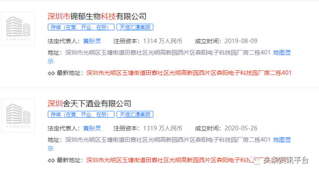 深圳锦郁生物公司在当下发展出来的子公司已有两家,分别是深圳舍天下酒业有限公司和安徽小石台富硒饮品有限公司,这两家公司的成立时间都在2020年5月份,值得一提的是,舍天下公司的注册地址为深圳市光明区玉塘街道田寮社区光明高新园西片区森阳电子科技园厂房二栋401,与锦郁公司的注册地址完全一致。