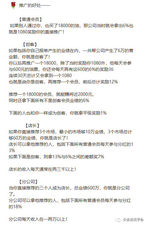 第四,分公司:当A直接推荐的三个人成为店长,总业绩达到600万元时,A就是分公司了。分公司可以拿他推荐的人包括下面所有普通会员每天参与分红的18%,据推算,分公司每天收入在一两万元以上。