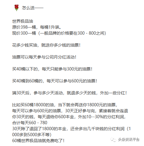 这个模式通俗来讲的话,按照推广人员阿伟(化名)的说法就是:原价398元一桶,每桶1升装,现价300元一桶(一般品牌的价格要在300元到800元之间),并且,花多少钱买油,就送多少钱的油票,油票可以每天参与公司月分红活动。买40桶以下的,每天只能参与300元的油票,买40桶到60桶的,每天可以参与600元的油票。满30天后,参与多少天活动,就退多少天的钱,外加一些分红。比如买60桶18000元的油,当下就会再送18000元的油票,每天可以参与600元的油票,30天正好参与完,紧接着就会连退参与者30天的钱,每天退给参与者600本金,外加10%到30%的分红利润,合计每天660元到780元。30天后,参与者除了拿到了公司退回来的18000元的本金,其账户还会多出几千块钱的分红利润(1000多到5000多不等),也就是说,60桶油完全属于免费拿的。