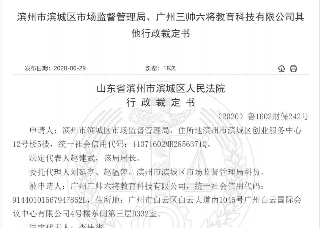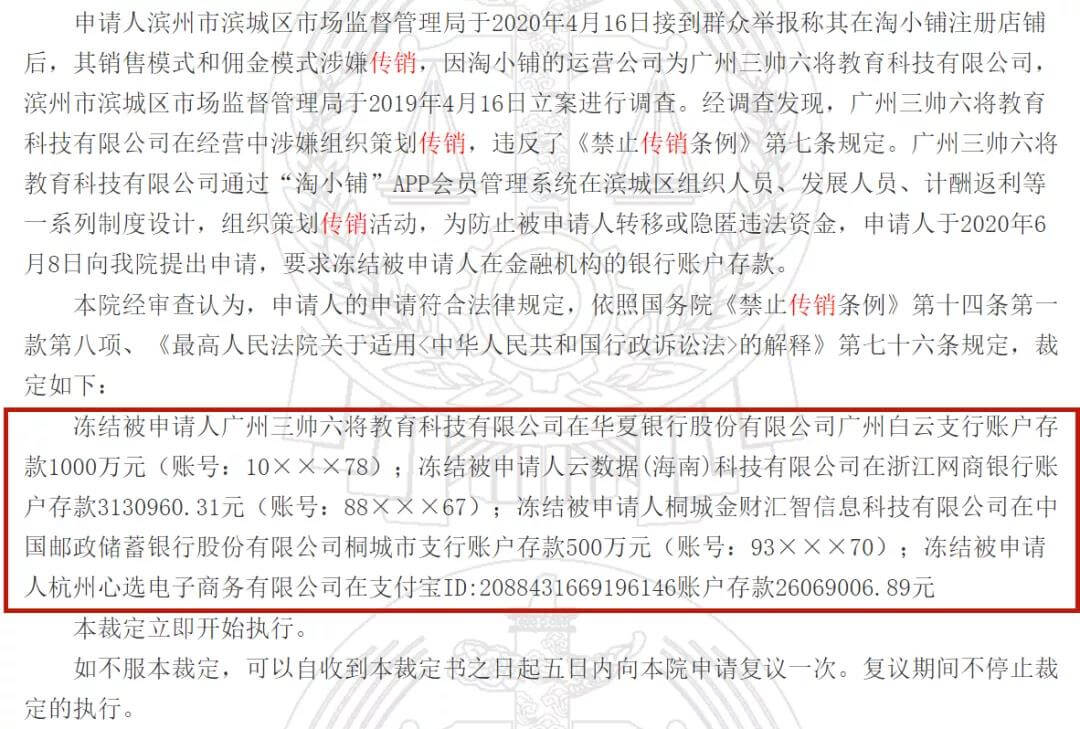 据《行政裁定书》显示,滨州市滨城区市场监督管理局于2020年4月16日接到群众举报称其在淘小铺注册店铺后,其销售模式和佣金模式涉嫌传销,因淘小铺的运营公司为广州三帅六将教育科技有限公司,滨州市滨城区市场监督管理局于2019年4月16日立案进行调查。