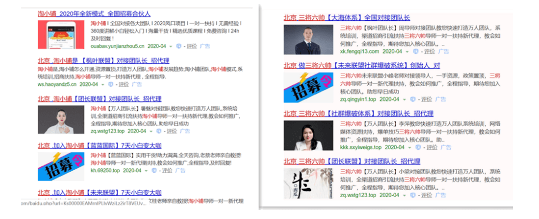 这也就是目前淘小铺出现许多在百度推广上主动打广告的原因,例如:未来联盟、枫叶联盟、团长联盟等,点开一看均是关于淘小铺的广告,还不忘记狠狠贴上阿里强大的背书。此外,三帅六将不少销售团队也争先恐后主动打起广告,随便点开都是淘小铺推荐广告。