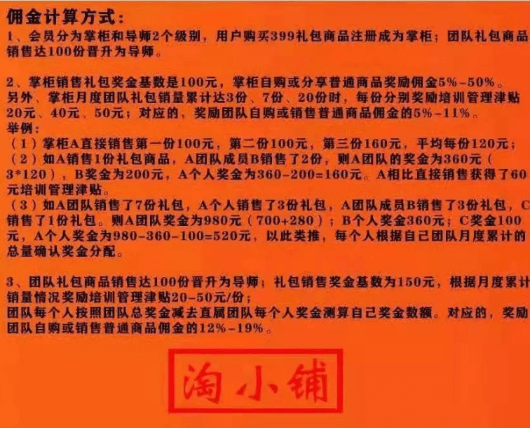 据了解,目前普通人有两种方式参与淘小铺:免费参与 (卖货有佣金,没有团队奖);399元高佣商品(卖货和团队都有佣金)。相关人士透漏,免费的是淘小铺官方运营的,而后者就是与淘小铺签约的各大代理销售公司,其代理模式被不少知乎的网友质疑涉嫌传销。