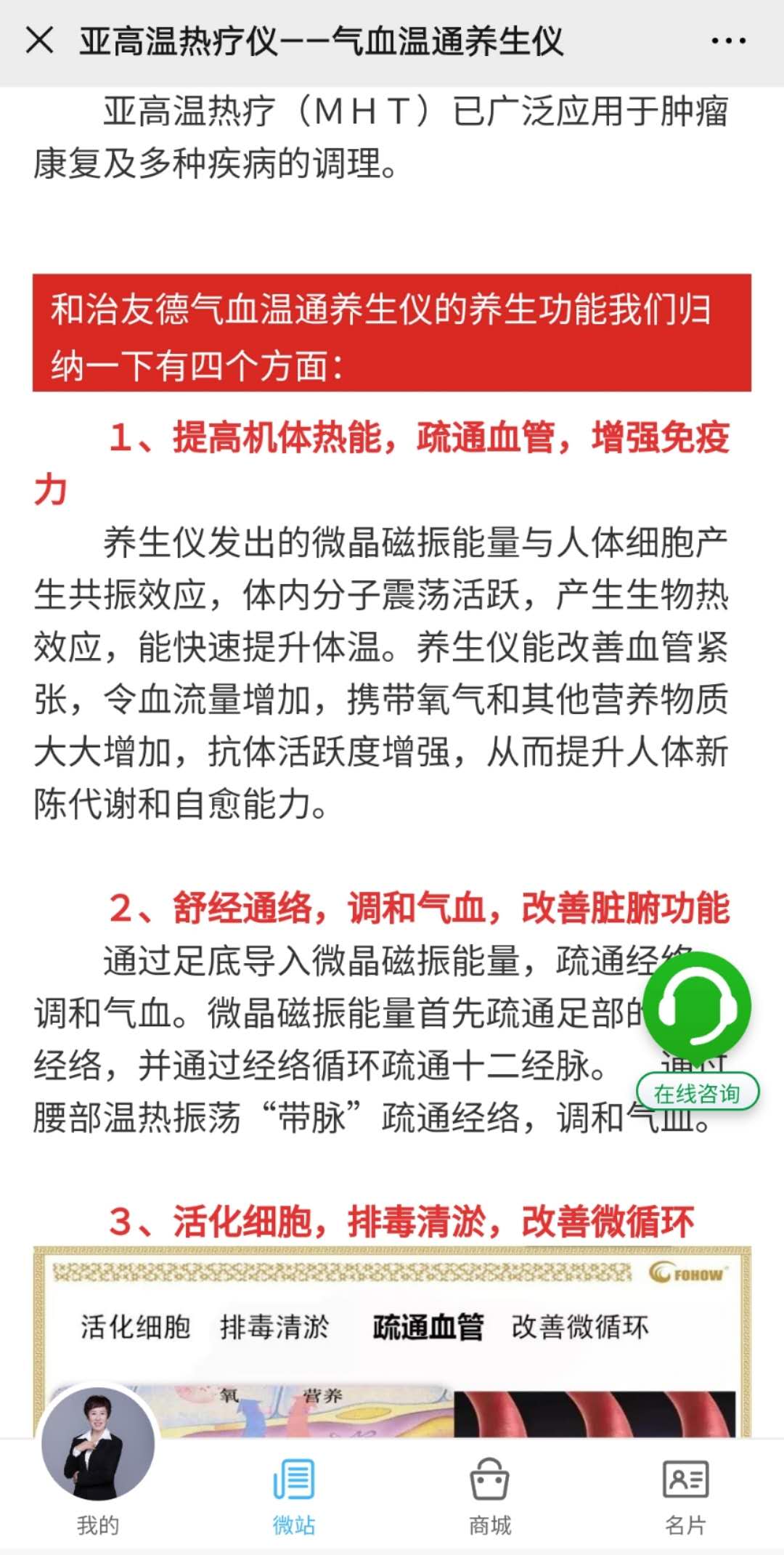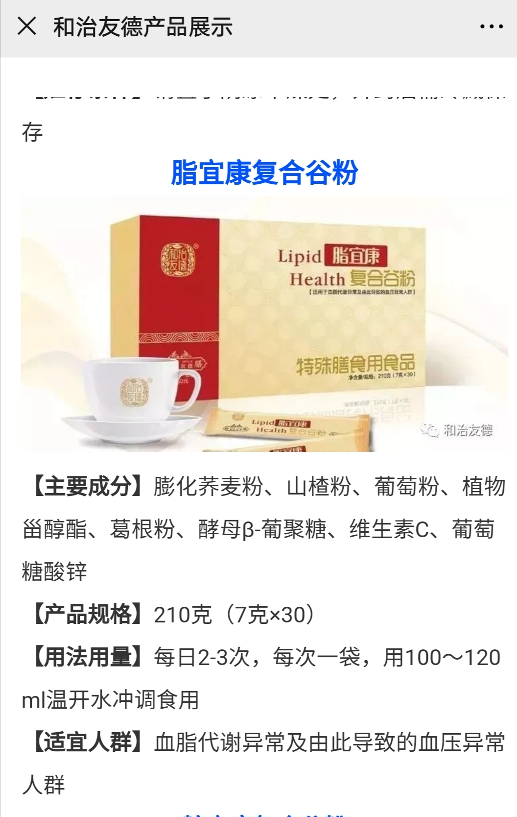 和治友德公司在其宣传资料上宣称:“亚高温热疗仪”也就是气血温通养生仪,称气血不足的结果会导致脏腑功能的减退,引起早衰病变等,该仪器功能主要有增强免疫力、调和气血排毒清淤、改善脏腑功能等。“脂宜康复合谷粉”适宜血脂代谢异常及由此导致的血压异常,“糖宜康复合谷粉”适宜糖代谢异常人群,“骨宜康复合谷粉”适宜骨关节受损及需要补钙人群。