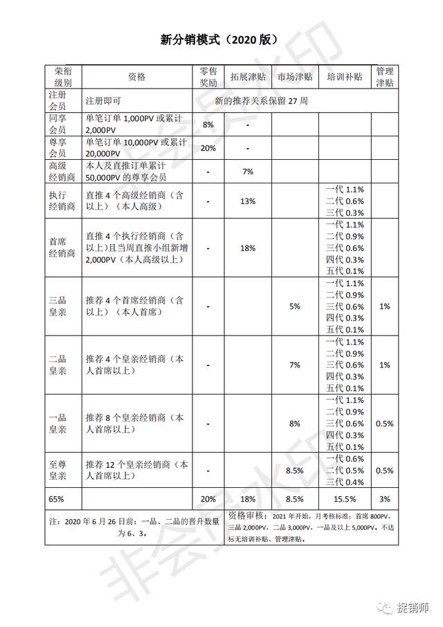 首席经销商:直推4个执行经销商(含以上)且当周直推小组新增2000PV(本人高级以上),拓展津贴18%,同时可拿五代的培训补贴;