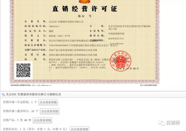 2016年5月同仁堂健康获得商务部直销经营许可证。