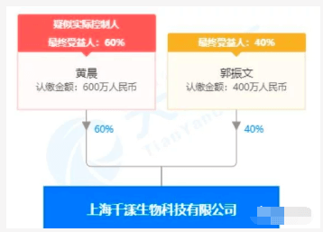 天眼查显示,上海千漾生物成立于2019年5月16日,注册资本为1000万元。黄晨为监事,也是持股60%大股东;郭振文是法定代表人、执行董事,也是持股40%的二股东。