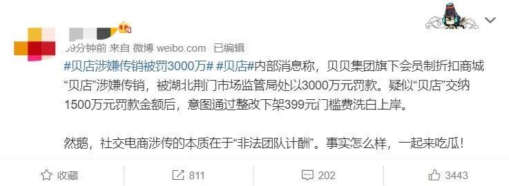 7月2日,美商社发现微博某大V爆料称:“内部消息,贝贝集团旗下会员制折扣商城‘贝店’涉嫌传销,被湖北荆门市场监管局处以3000万元罚款。疑似‘贝店’交纳1500万元罚款金额后,意图通过整改下架399元门槛费洗白上岸。”