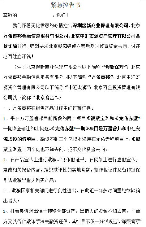 另外一位受害人小玲(化名),为了帮助和她一样讨不回钱款的投资人们,还专门为此书写了控告书。