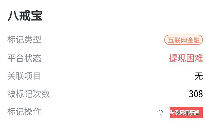 据了解,北京万盈睿邦金融信息服务有限公司旗下主要产品是全资理财平台八戒宝和至尊宝等,经查腾讯灵鲲金融风险查询举报中心,我们发现八戒宝的平台状态已被标记为提现困难,被标记次数为308次。