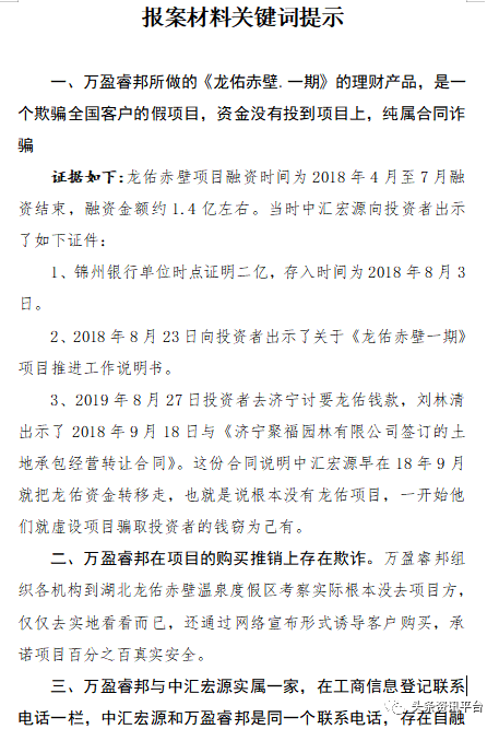 受害人张晨(化名)的经历与阿倩相仿,最开始万盈睿邦方面有个讲师队伍跑来当地进行宣传,说是资产管理公司要处理龙佑赤壁项目,并以央企项目处理不良资产为由,募集资金。与此同时,业务员承诺百分之百安全,有第三方担保,合同有银行监管。由于这个业务员住的地方和张晨家也离得不远,如此,张晨便信以为真。至于投资结果,现在看来令其无比悔恨——投进去的钱仿佛只是打了个水漂,一去不返。如今,这个业务员的服务态度与当初也是判若两人,“从出事到现在,这个人嘴里就没有一句真话,人现在也找不到了。之前我找她处理相关问题,她还一直不耐烦,好像自己没一点责任,是我们自作自受。”