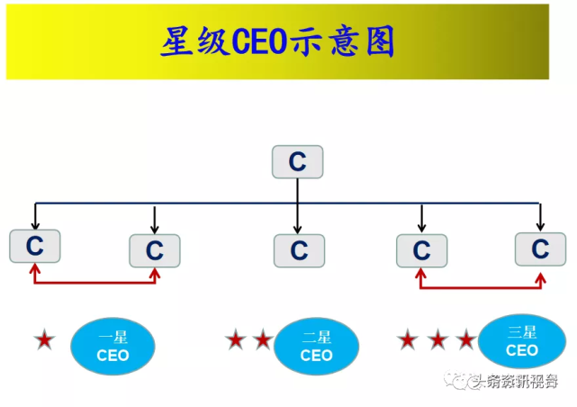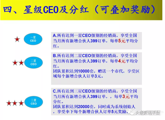 (2)二星CEO:①培养三位CEO领导人即可成为二星CEO。②公司拿出所有新增合伙人订单的每单4元平均分给二星CEO。目前公司仅有7位二星CEO。例如,公司当月完成2万单,则拿出8万元平均分给所二星CEO,8万÷7=11400多元,意味着每位二星CEO可以拿一万一千多分红。