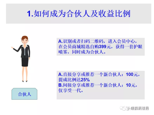 (1)合伙人:①自用省钱,分享赚钱。消费者下单购买一套汉方视康量子护眼喷雾399元,就获得合伙人资格。②合伙人直推一个合伙人,公司奖励100元(秒到),提成比例达25%。③合伙人间接推荐一个合伙人,奖励10元(秒到),仅享受一代。
