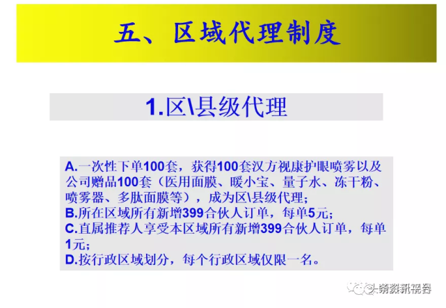 (1)区/县级代理:①一次性下单100套,获得100套产品和100套赠品,并成为区/县级代理。②所有本地区(以快递落地地址为准)每一个399订单,奖励代理5元。③直属推荐人享受每单1元。例如,贵阳市南明区,本月有5000单寄到南明区,那么南明区区代可以得到2.5万元收入。上级推荐人得到每单1元,也就是5000元。④每个行政区域仅限一名。